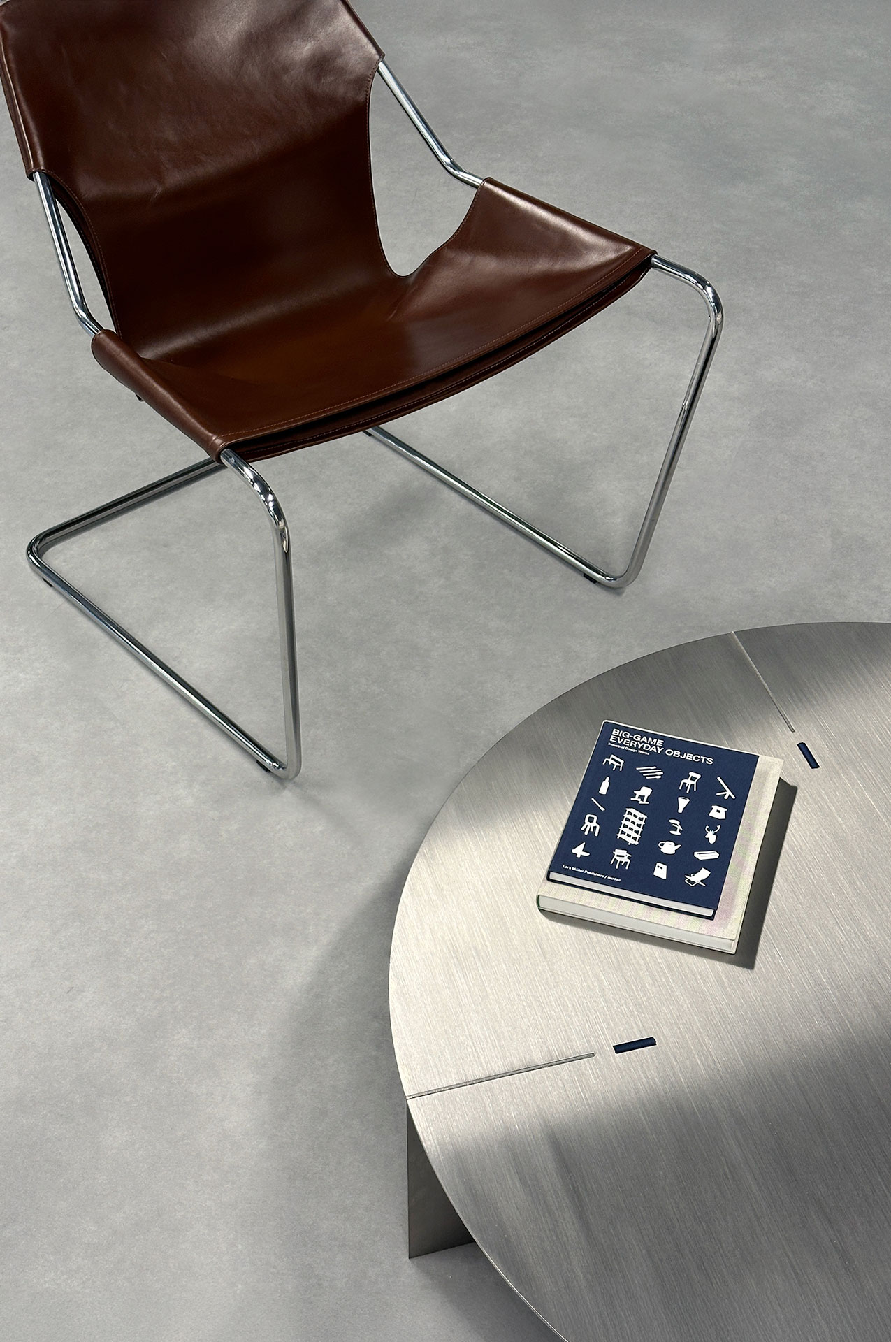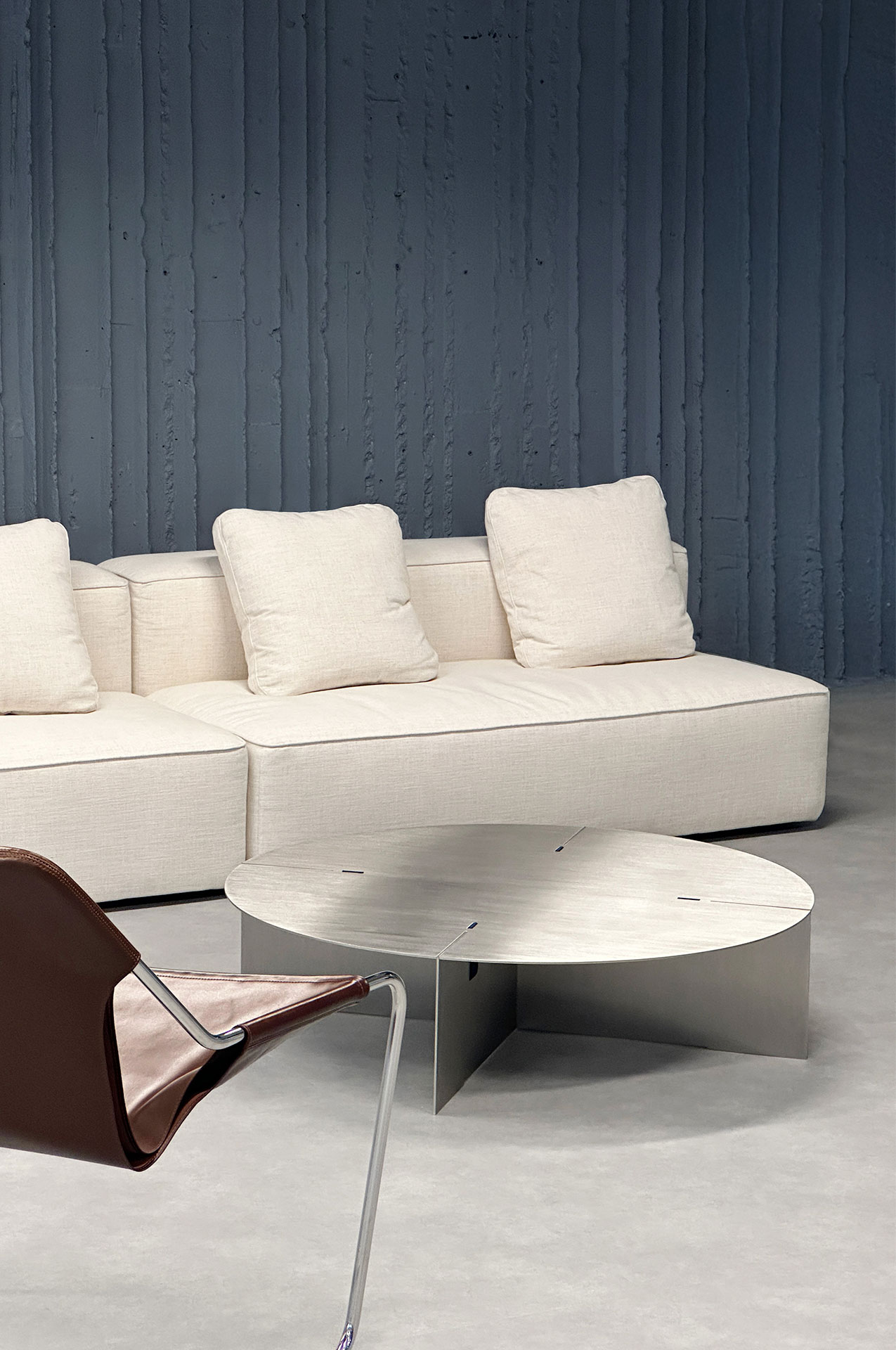Na mesa de centro Alfaiate, cortes precisos em aço inox formam os pés e o tampo, que se encaixam facilmente. A percinta e a fivela unem e travam todas as peças, eliminando a necessidade de solda e garantindo a estabilidade. A durabilidade dos materiais torna as mesas ideais para uso em ambientes internos e externos.