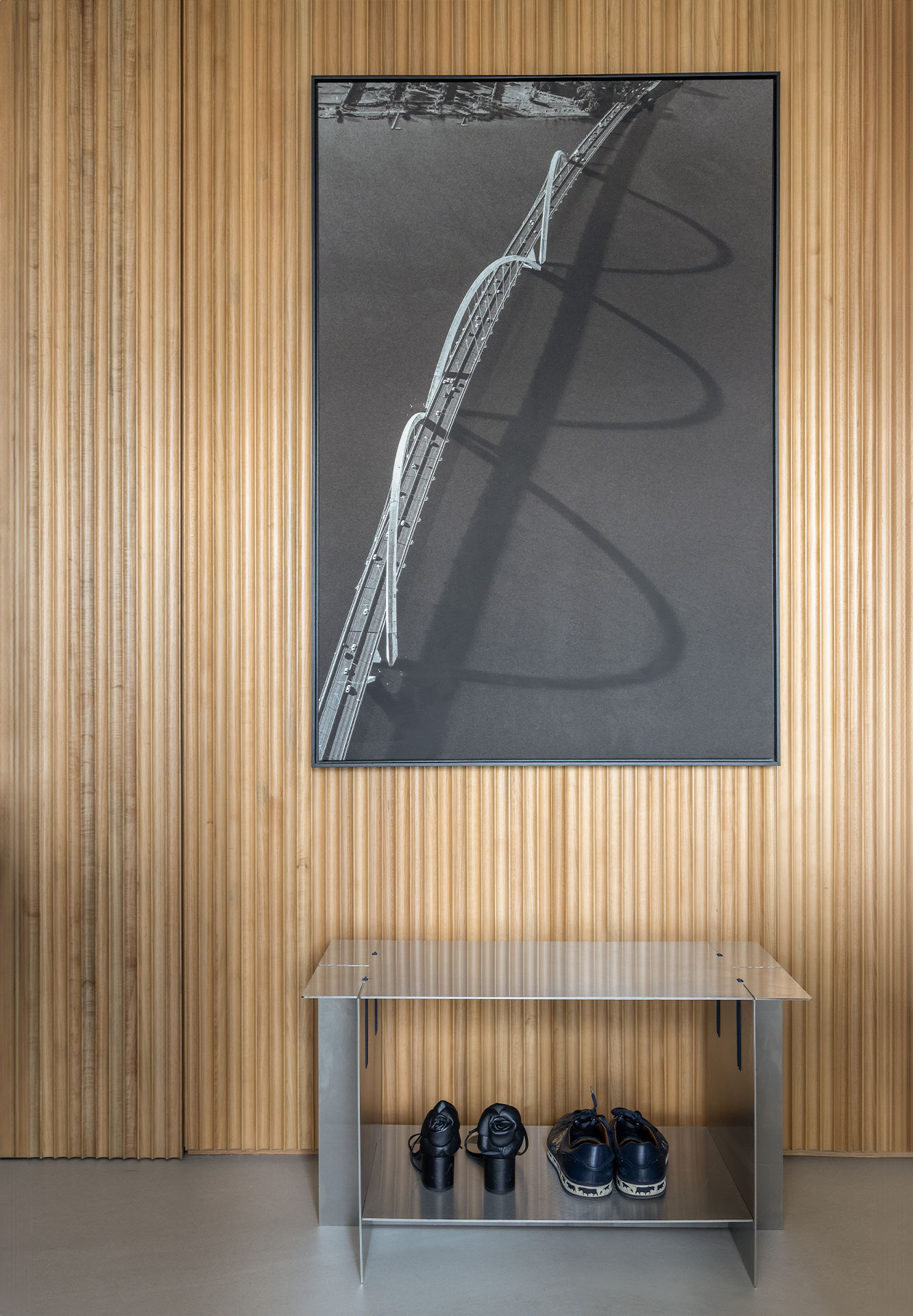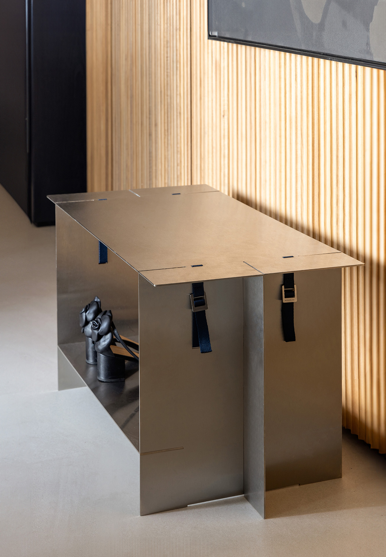 Na mesa de sapateira Alfaiate, cortes precisos em aço inox formam os pés e o tampo, que se encaixam facilmente. A percinta e a fivela unem e travam todas as peças, eliminando a necessidade de solda e garantindo a estabilidade. A durabilidade dos materiais torna as mesas ideais para uso em ambientes internos e externos, incluindo regiões litorâneas.
