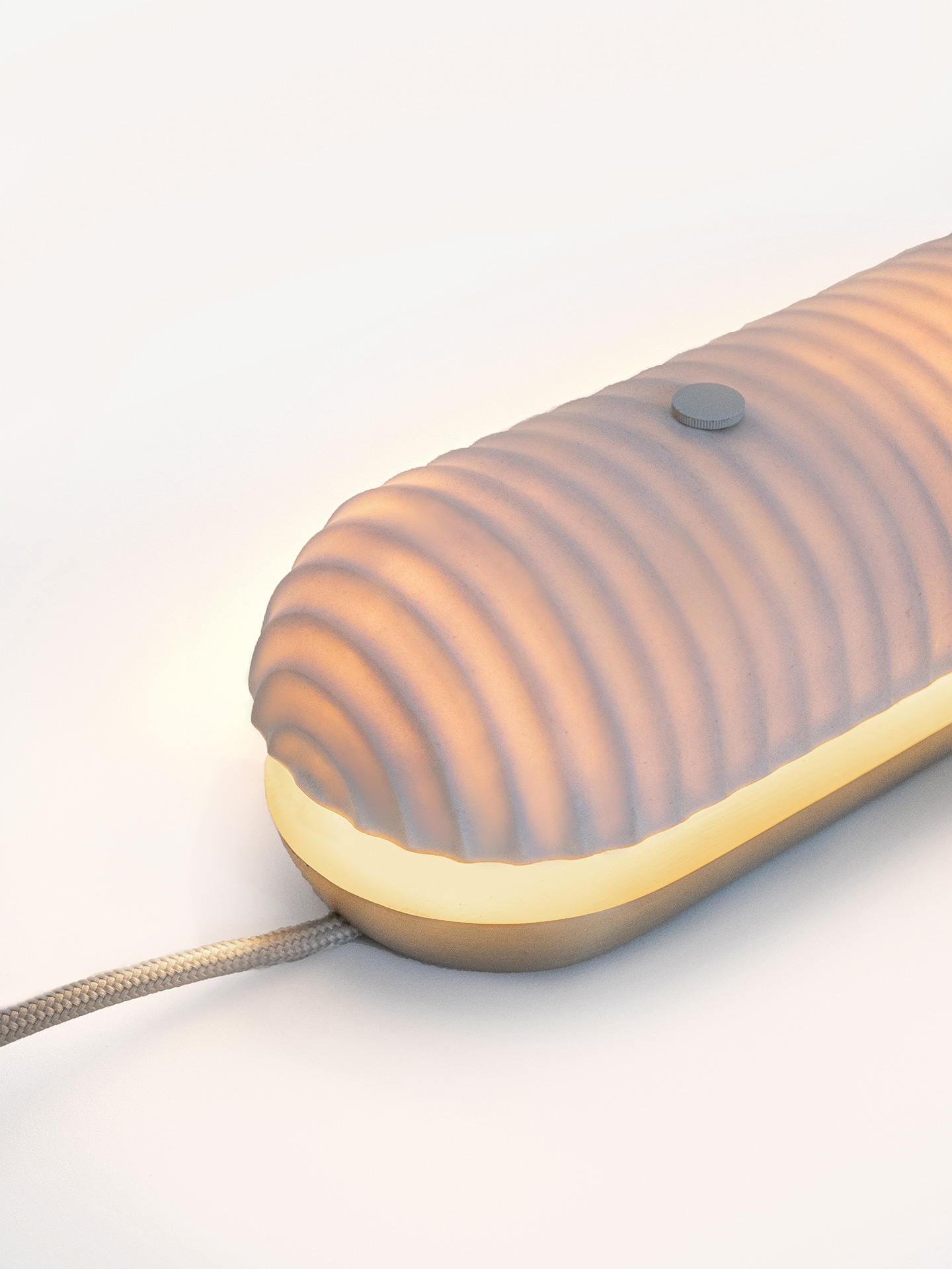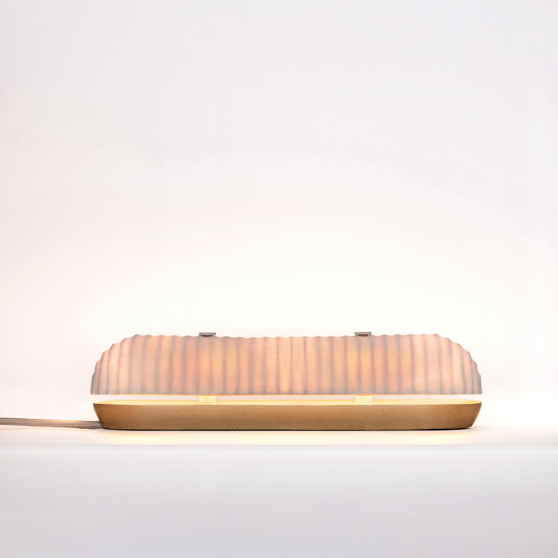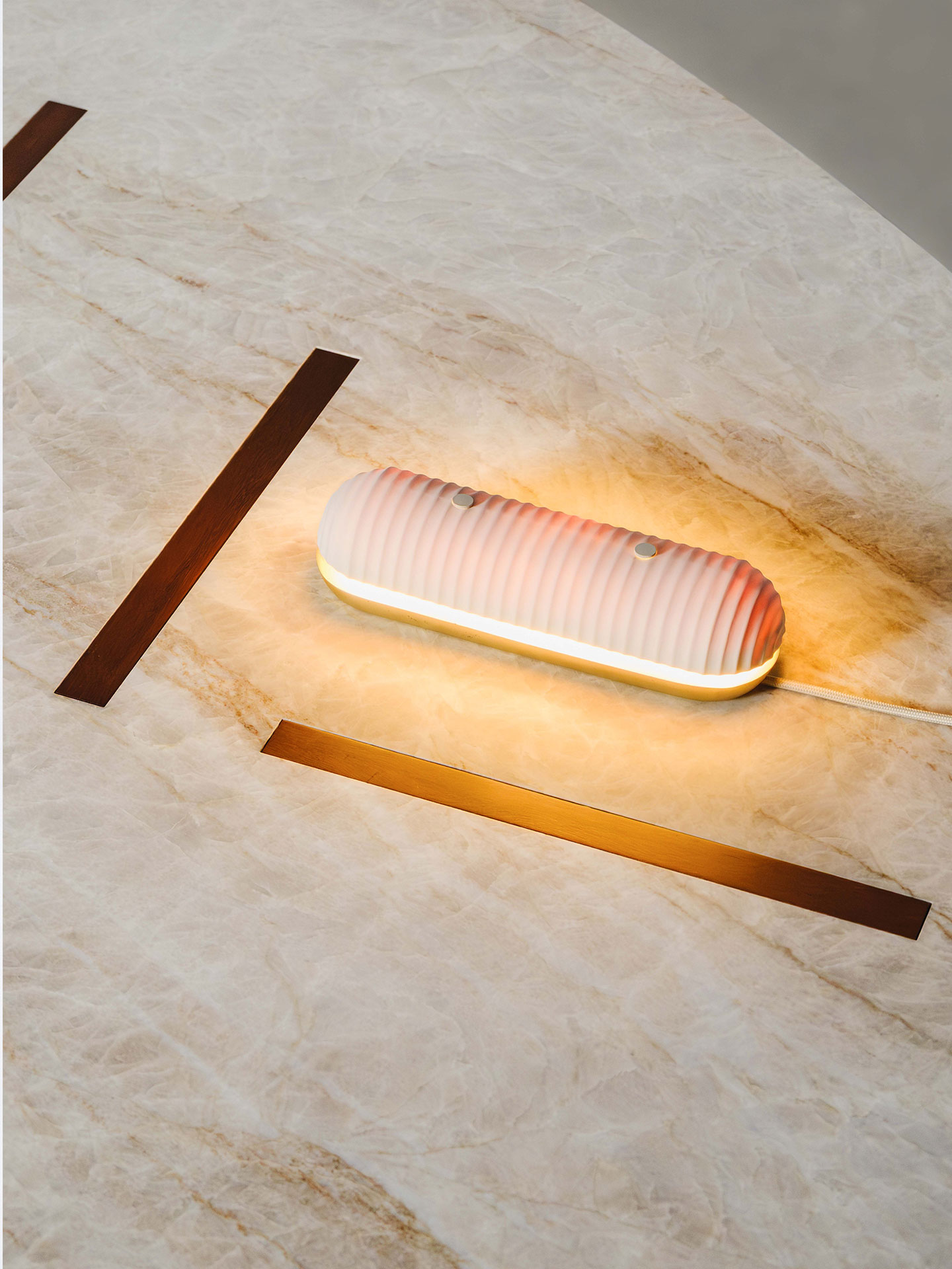 As cúpulas em porcelana filtram a luz e repousam sobre bases de latão fundido, num equilíbrio delicado entre leveza e solidez.