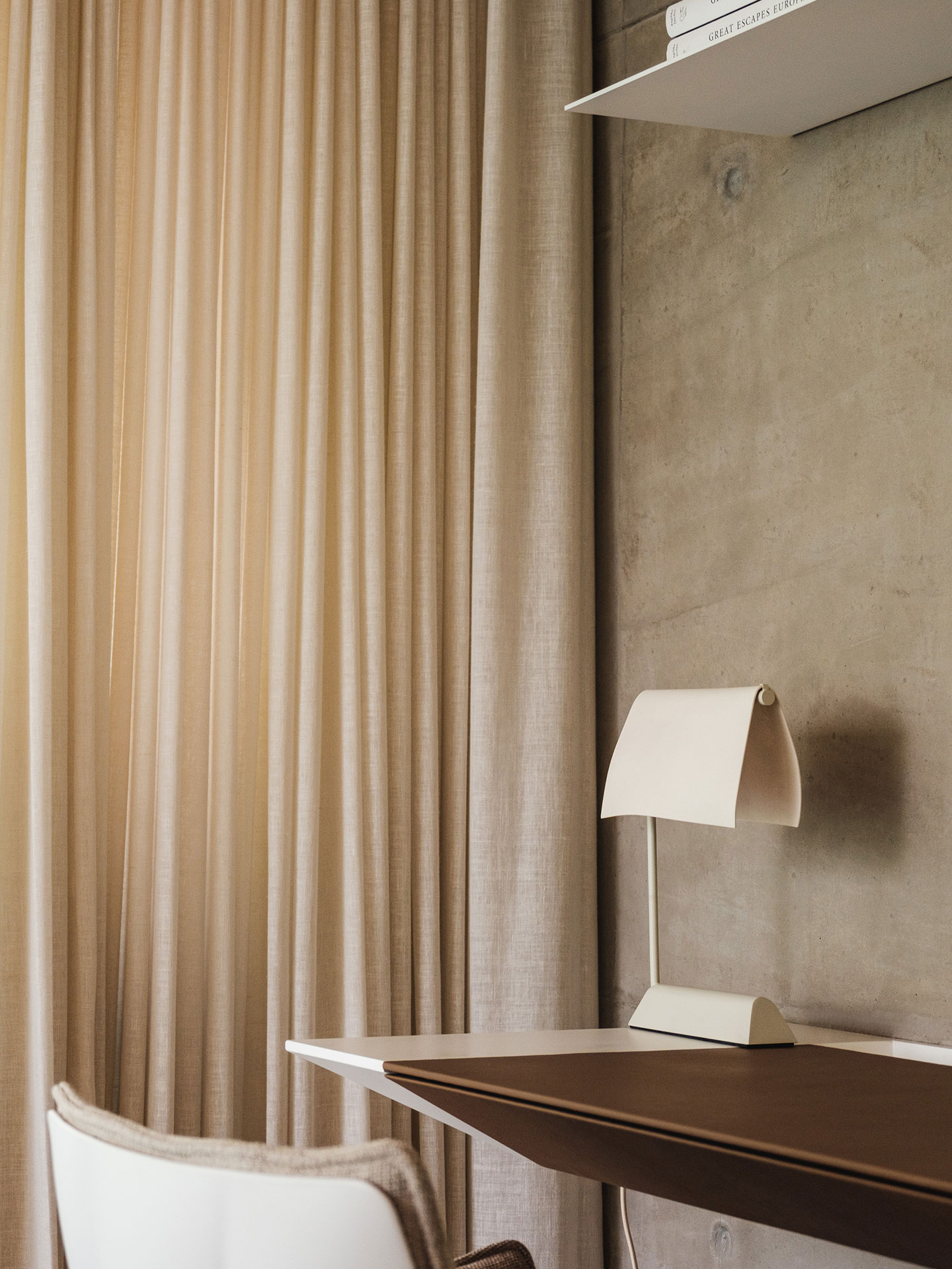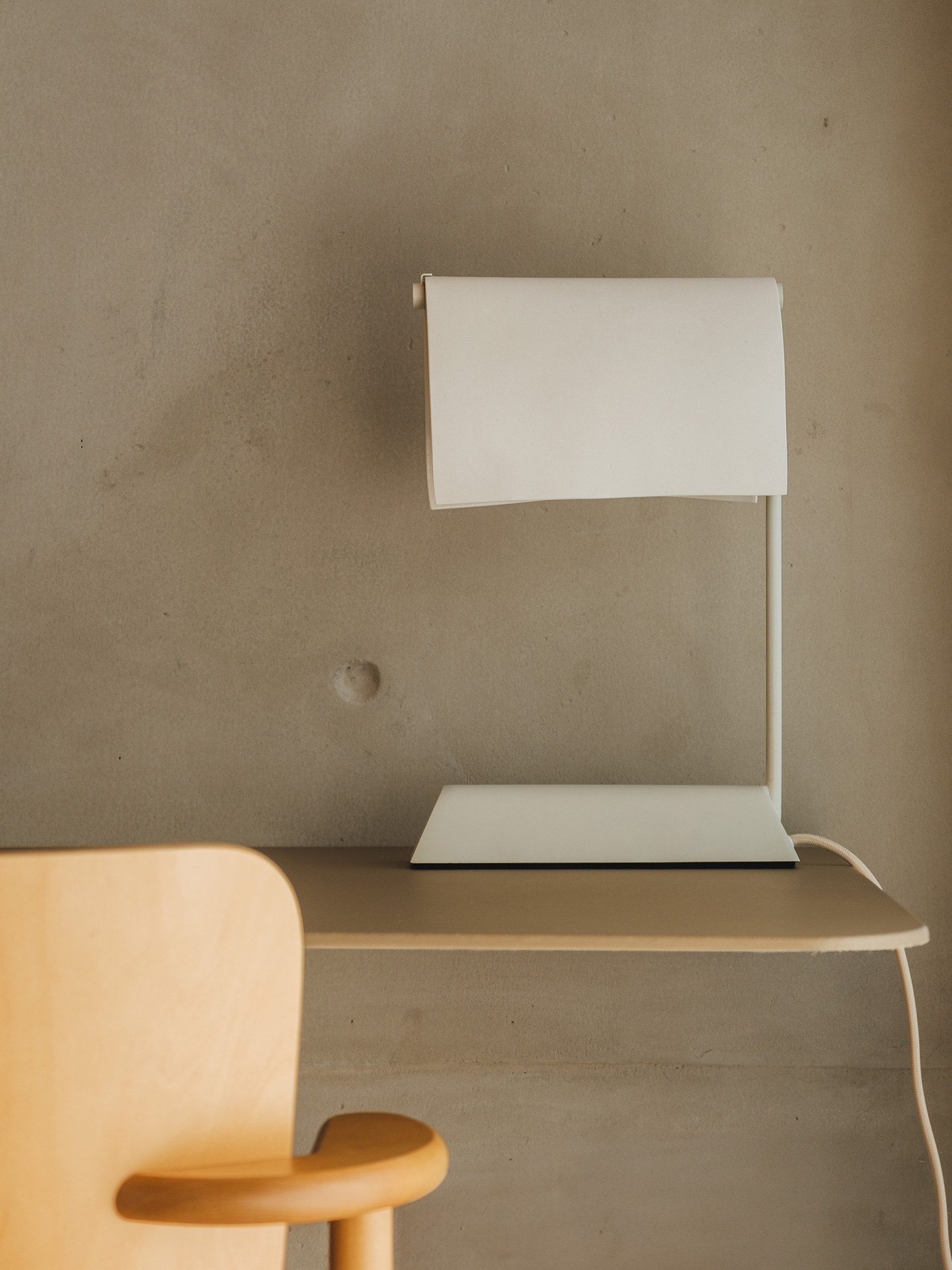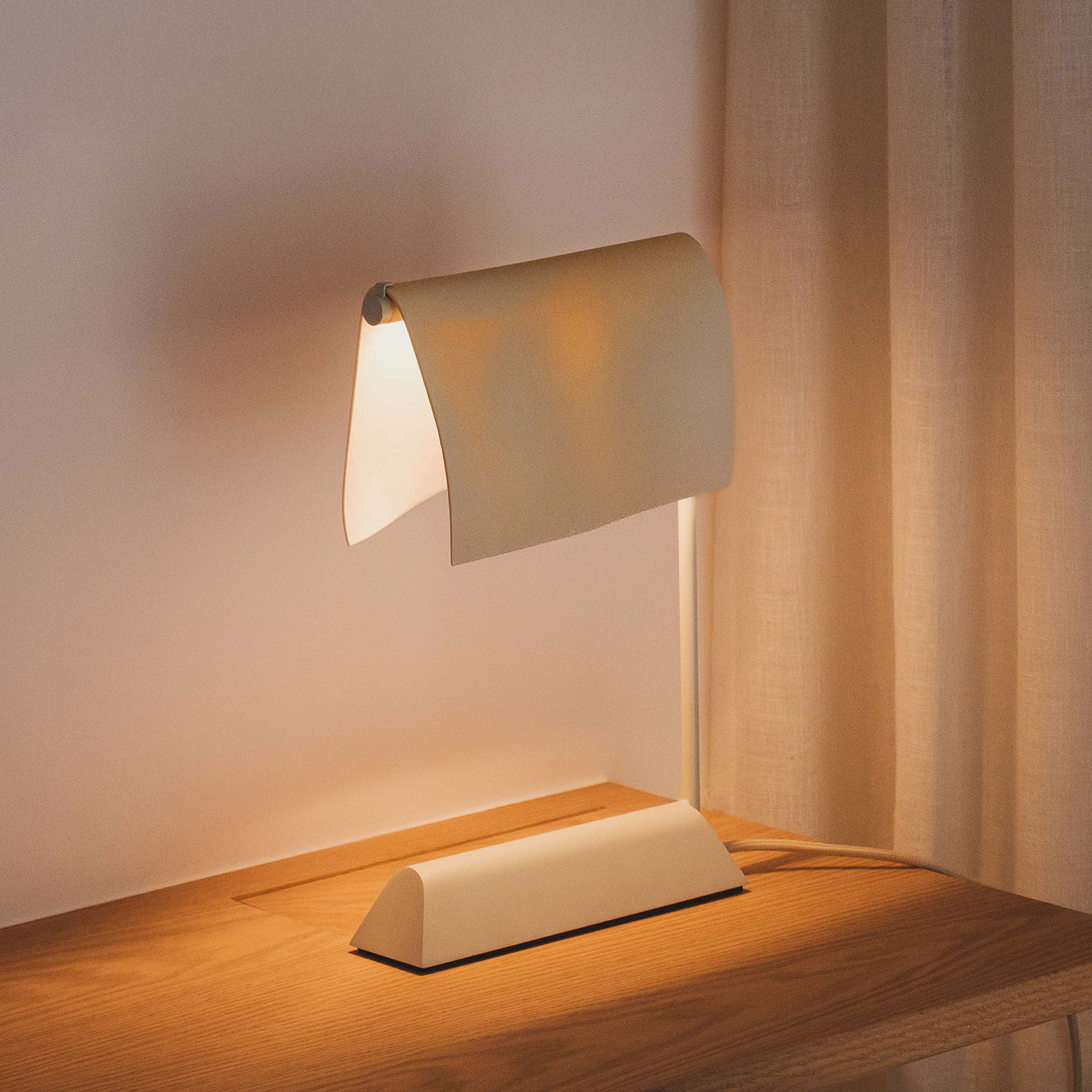 Feita em colaboração com o Atelier Nydia Rocha, a luminária de mesa Veleiro possui a cúpula apoiada em uma haste metálica ligada à base