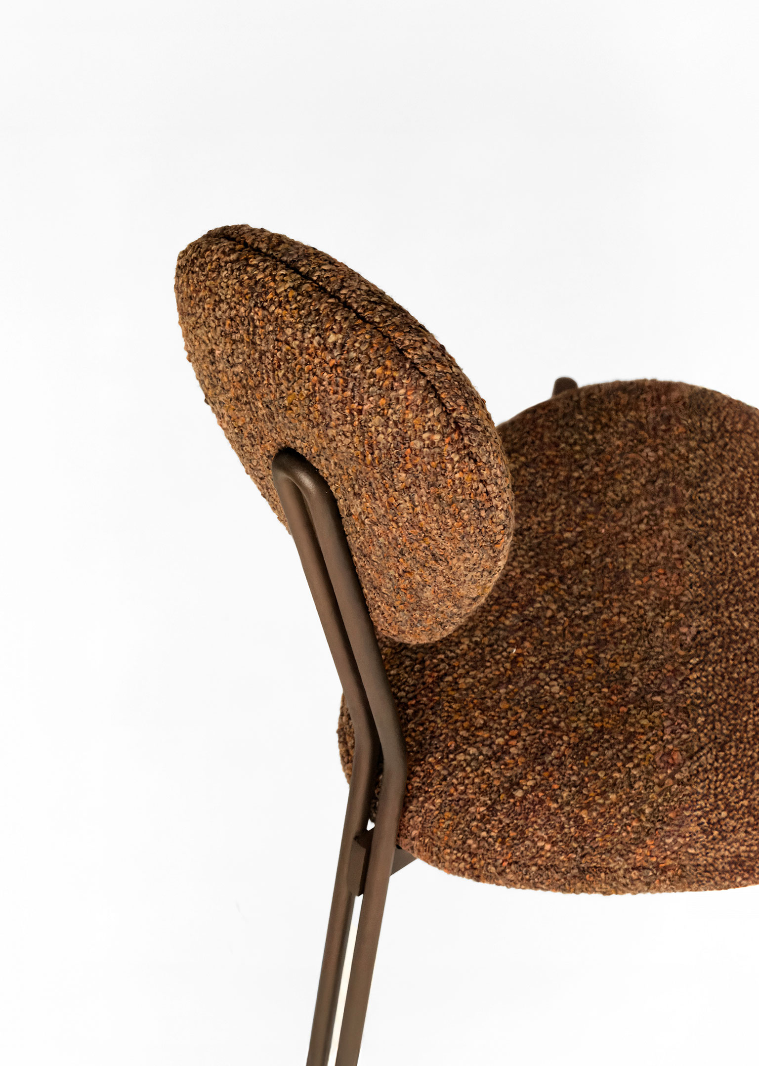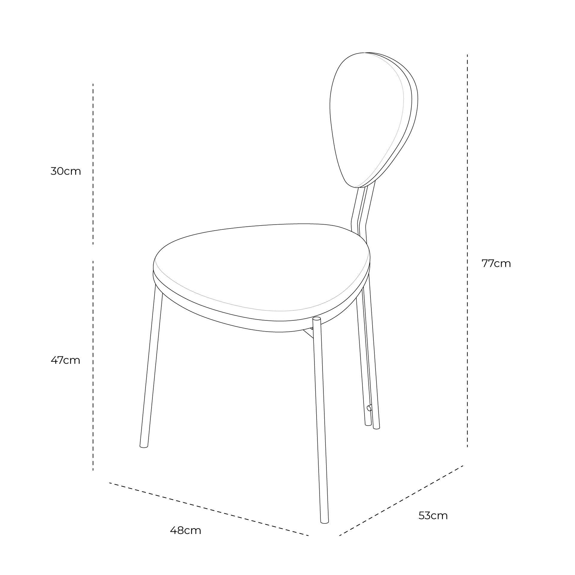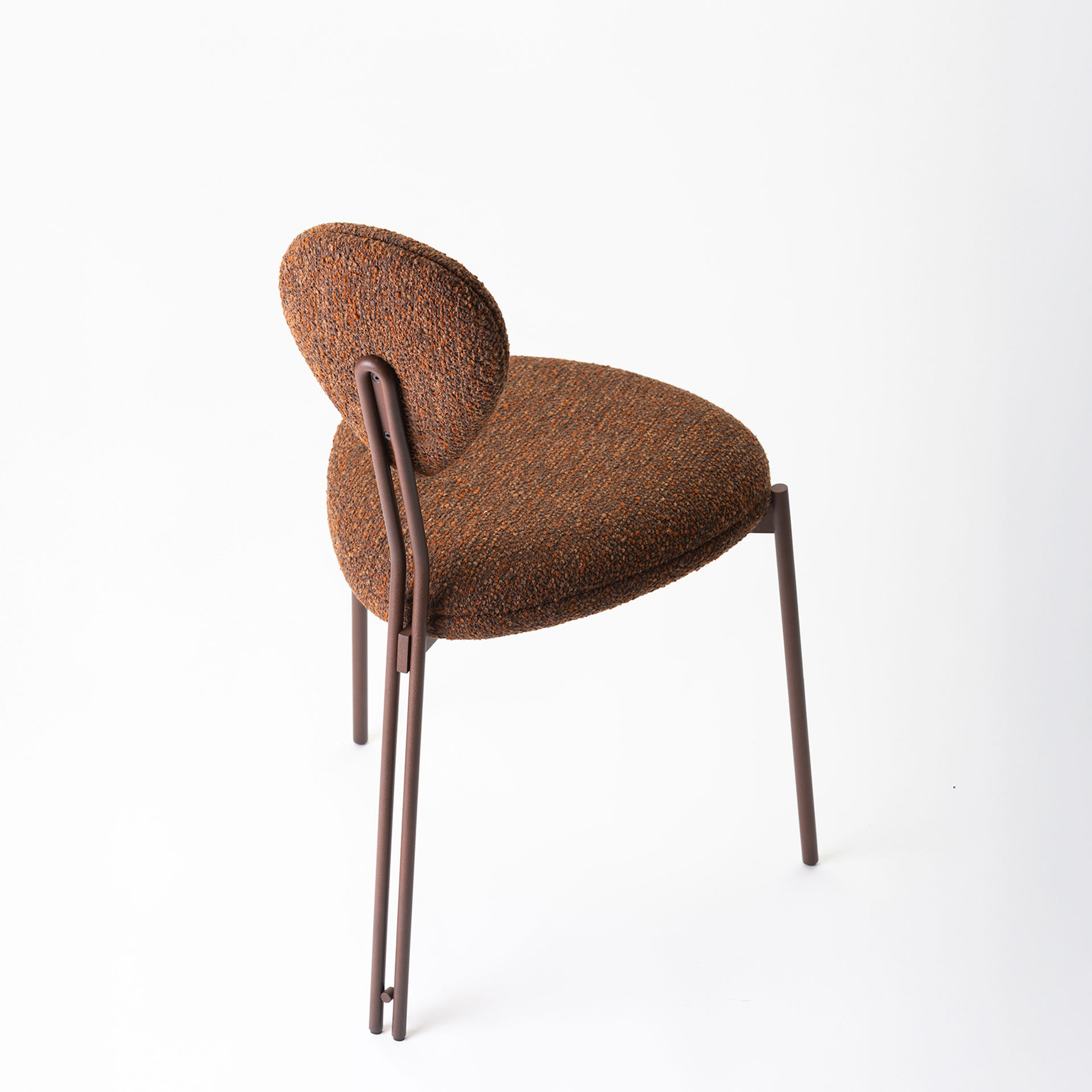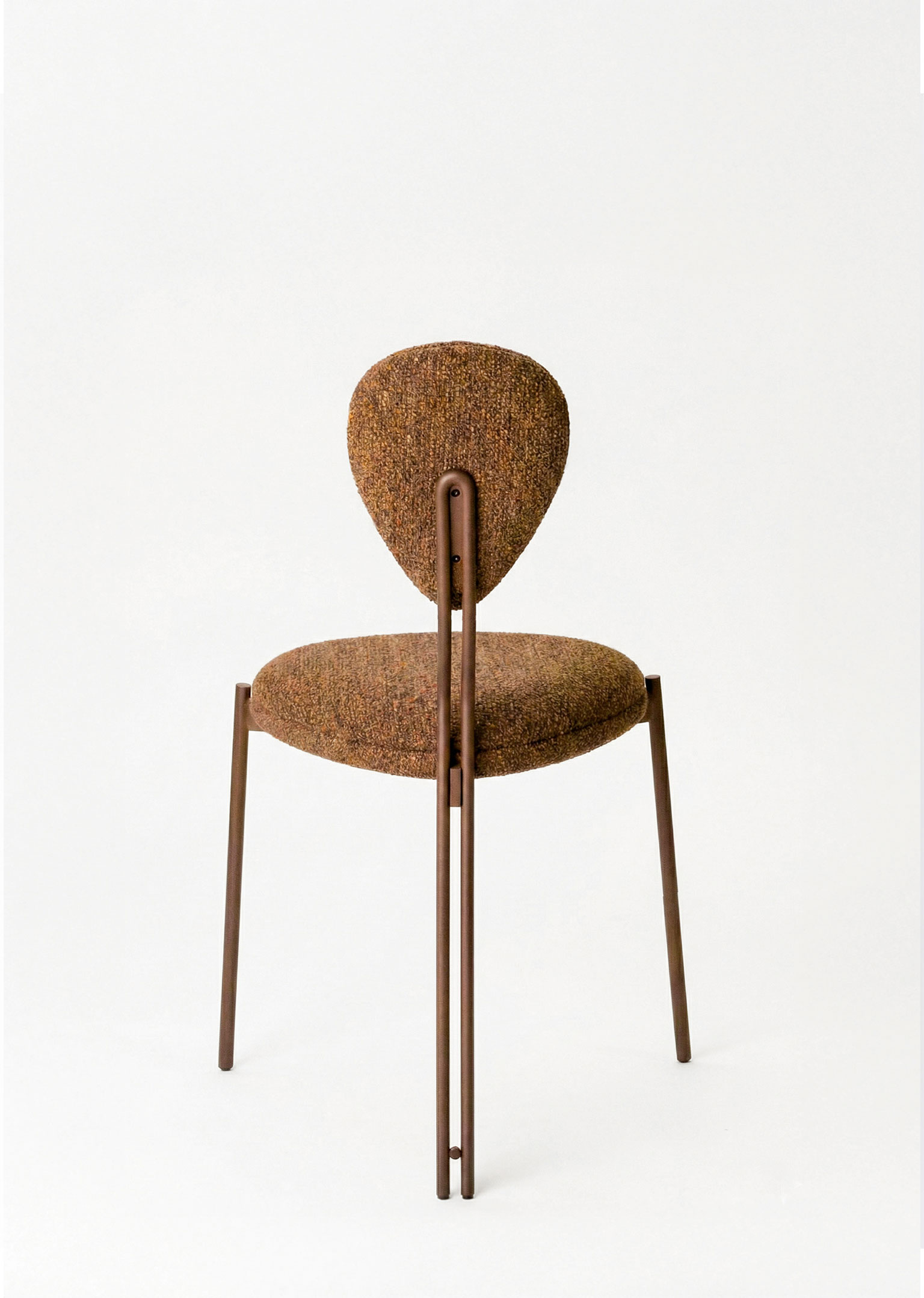 A Cadeira Pingo possui estrutura em aço apoiada em três pontos, solução que garante estabilidade e leveza visual. O assento e o encosto são fixados por meio de detalhes construtivos simples e aparentes, que reforçam a clareza do desenho. Com proporções compactas, as peças ocupam pouco espaço e funcionam bem em ambientes residenciais e comerciais.