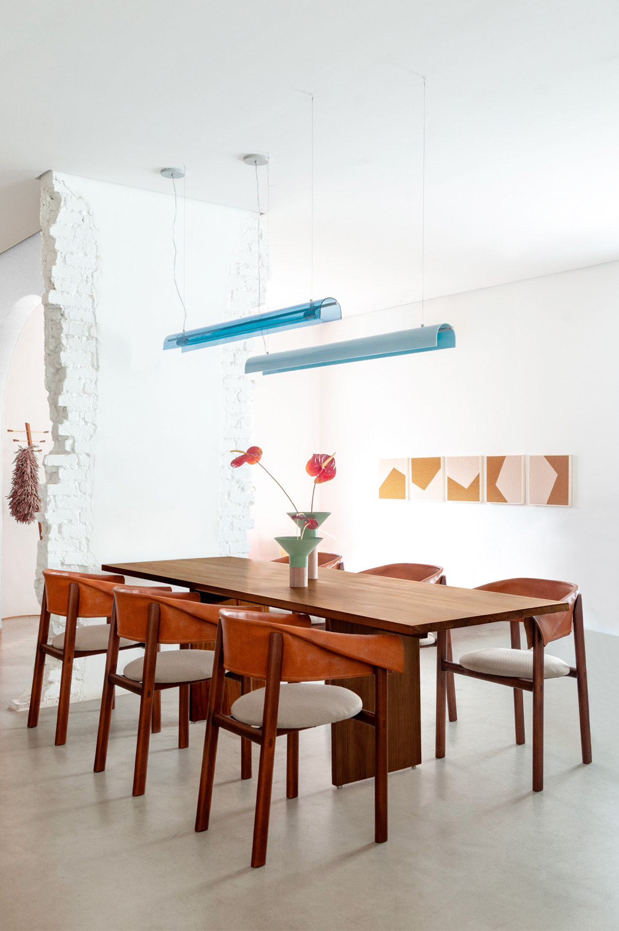 A cadeira Soleta resgata uma técnica tradicional de moldagem de couro, semelhante à utilizada em selas e calçados: água quente, vapor e conformação manual. Uma única peça de couro tipo soleta é recortada, dobrada e moldada para formar o encosto ergonômico, que se fixa diretamente à base em madeira maciça.