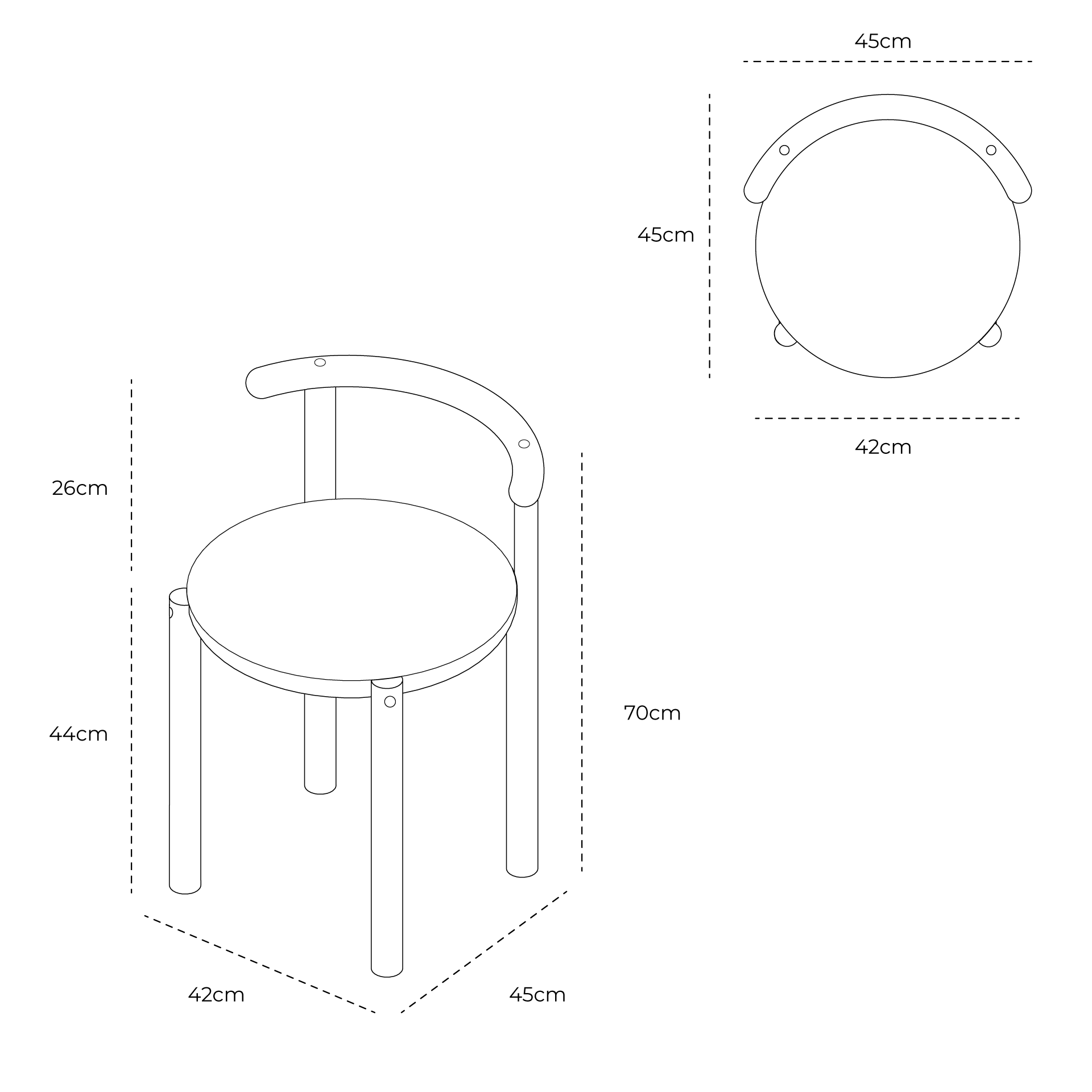 A Cadeirita encosto alto possui um encosto curvo ergonômico, com detalhes construtivos e linhas sintéticas que proporcionam resistência e leveza. A textura da madeira maciça torna cada peça única.